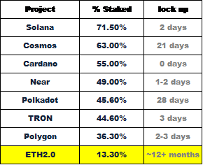 2) A relatively small percentage of total Ethereum tokens are currently staked. When compared to other major L1s, ETH has significantly less staked than other chains.