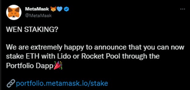 MetaMask is currently the most widely used crypto wallet, and their recent addition of direct integrations with LSD providers Lido and Rocketpool makes staking far more accessible and user-friendly. This also adds credibility to both providers by association with MetaMask's well-known and trusted brand. This could lead to more small-scale users beginning to stake their ETH.