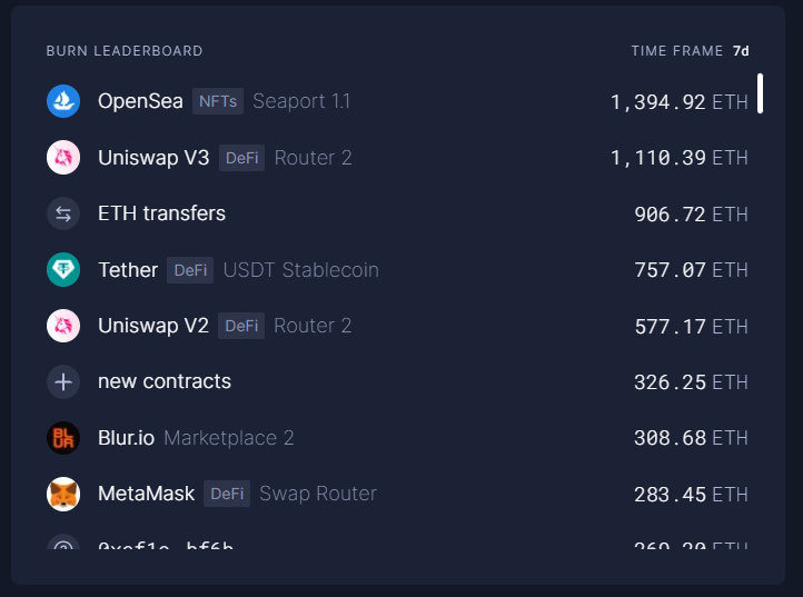 Here you can see OpenSea burns more ETH than Uniswap and Blur has overtaken MetaMask.