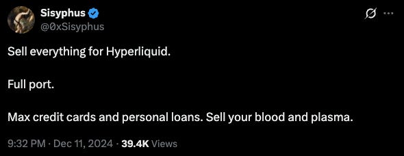 So a few months later, when I saw Jez, and Shoku, and countless others that I deeply respect on the timeline posting borderline hysterically about how impressive Hyperliquid was, I told myself it was too late. I had missed it. I convinced myself that I don't trade perps anyway and I should move on. Like an ostrich with a degenerative brain disease, I stuck my head in the sand and closed my eyes and ears.