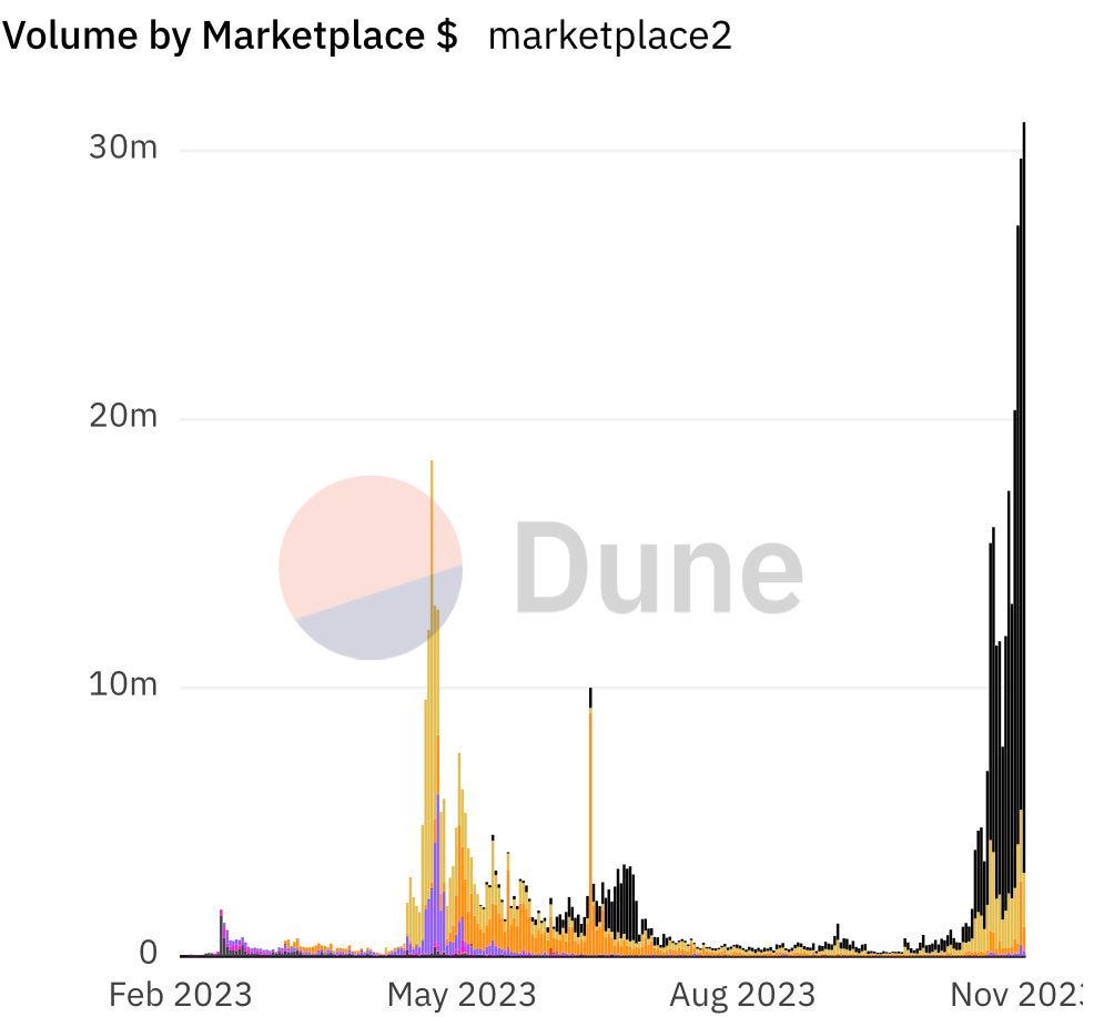 The logic here is that they are in the top 3 frequently for volume, so should provide good points, but once the Blur airdrop happens on Monday, it's likely NFT farming attention picks up again as people cope that they didn’t receive as much free money as their favorite Twitter engagement farmers.