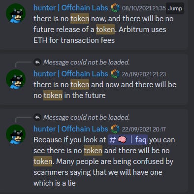 Source: Arbitrum Discord - 1.5 years ago the Arbitrum team was adamant there would be no token ever.