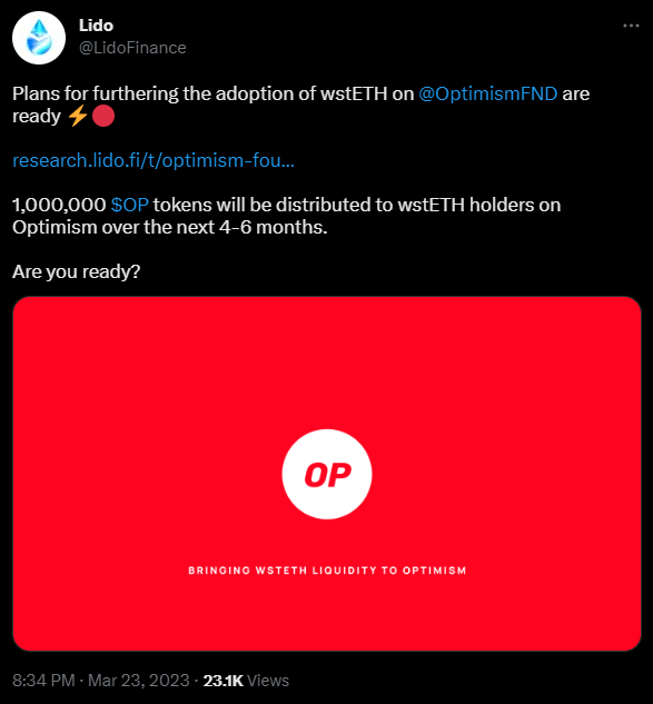 As shown below, by holding your WstETH on Optimism, you will receive free OP tokens. I'm sure that as the battle heats up and chains fight for apps to deploy with them, more of this behaviour will take place.